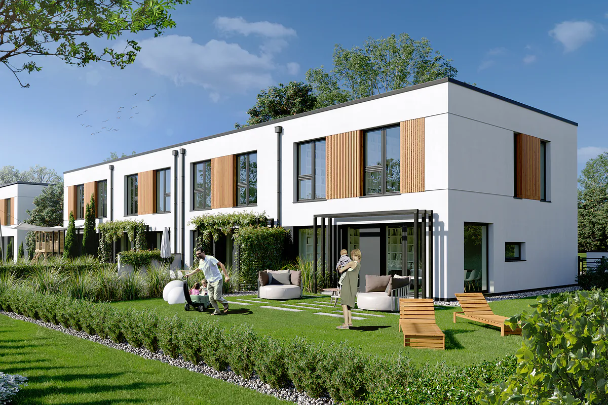 Domy dwukondygnacyjne, o pow. ok. 119 m², w układzie 4-pokojowym. Nowoczesna architektura, stonowane barwy i funkcjonalny rozkład zapewniają komfort bez zbędnych metrów. Otwarta strefa dzienna na parterze naturalnie łączy się z ogrodem, a piętro to prywatna część z sypialniami i łazienką.
